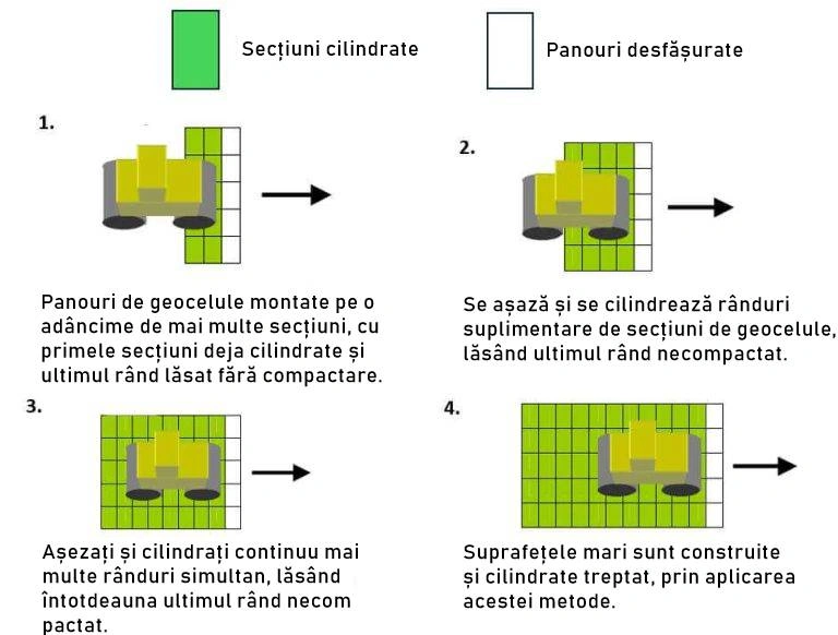 După așezarea mai multor rânduri, acestea trebuie cilindrate, lăsând ultimul rând necompactat pentru a fi gata de conectarea următoarelor secțiuni.